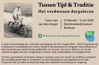 In deze tentoonstelling ziet u het werk van fotograaf Jan denHengst (1934 – 2022). Hij groeide op in Boskoop en ontwikkelde zich na een verblijf in het buitenland tot fotograaf. Vanuit Boskoop en later Aarlanderveen werkte hij aan opdrachten en vrij werk. Jan trok er altijd op uit met zijn camera en legde vast wat hij tegenkwam: mensen, werk, landschappen en dorpsgezichten. De foto’s, grotendeels uit de jaren zestig en zeventig, tonen een wereld van traditie en ambacht die inmiddels grotendeels is verdwenen. De tentoonstelling is samengesteld uit het rijke fotoarchief dat Jan naliet en biedt een bijzonder tijdsbeeld van Boskoop en omgeving.
